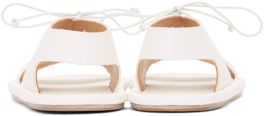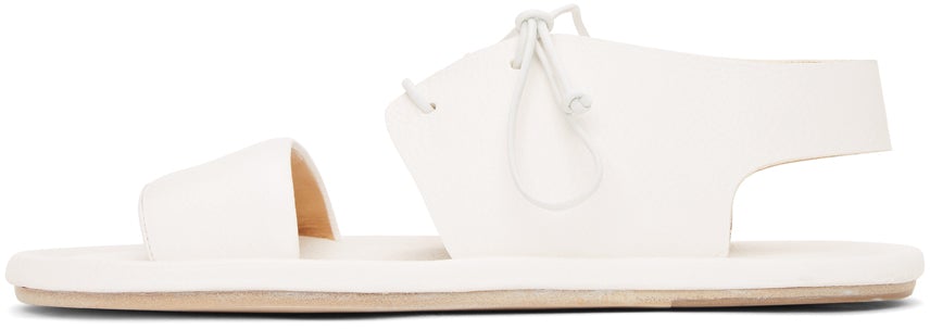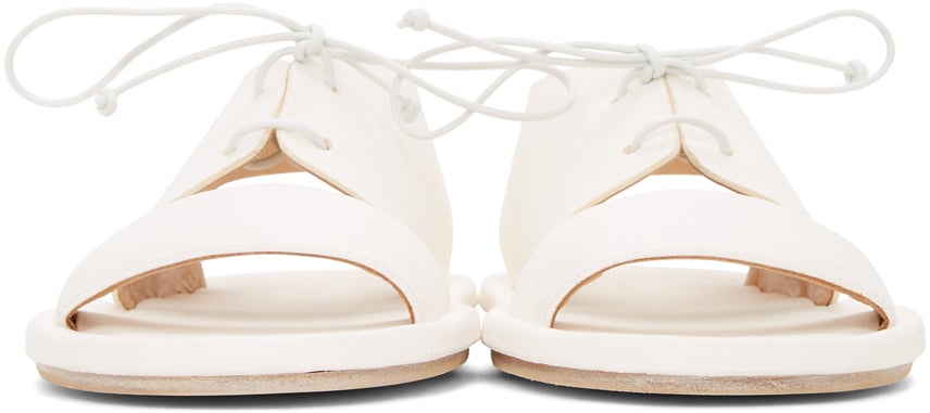 Grained leather sandals in white. Open round toe. Padded strap at vamp. Tonal lace-up closure. Cut-out at heel counter. Logo embossed at padded leather footbed. Leather sole in beige. Supplier color: White Leather. Brand: Marsèll