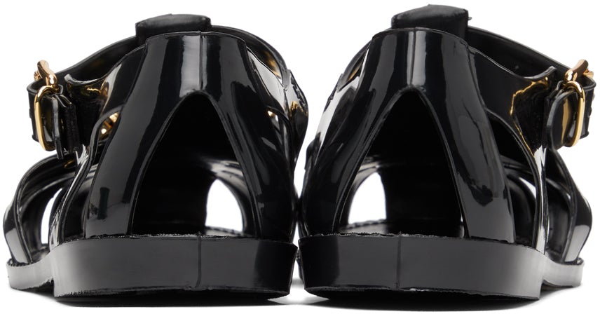PVC sandals in black. Round toe. Strap featuring logo hardware at vamp. Adjustable ankle-strap with pin-buckle fastening. Tonal logo stamp at footbed. Rubber sole. Gold-tone hardware. Supplier color: Black Pvc, rubber. Brand: Moschino