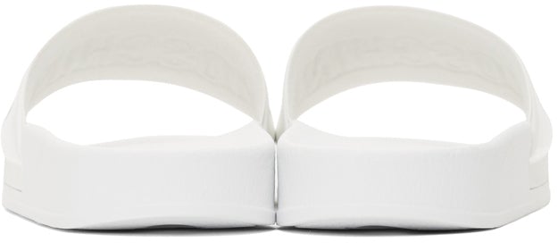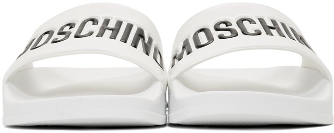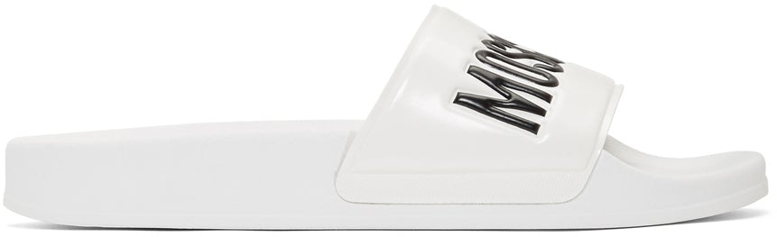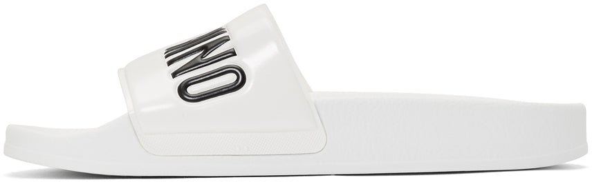 Rubber slip-on sandals in white. Open round toe. Logo embossed in black at vamp. Textured foam rubber midsole. Tonal treaded rubber outsole. Supplier color: White Rubber. Brand: Moschino