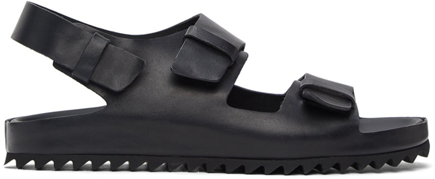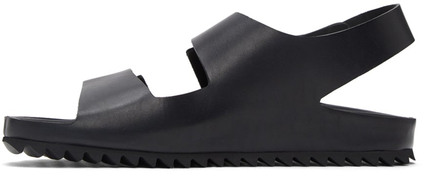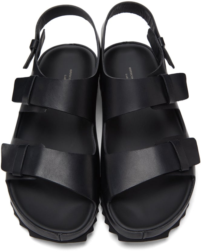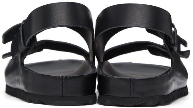 Handcrafted buffed leather sandals in black. Open round toe. Leather straps at vamp. Logo stamp in grey at tonal molded footbed. Tonal buffed leather lining. Tonal covered midsole. Tonal treaded rubber sole. Supplier color: Black Upper: leather. Sole: rubber. Brand: Officine Creative