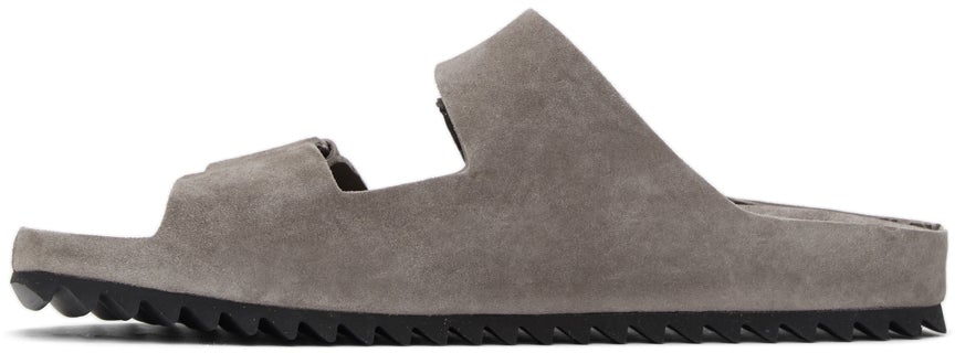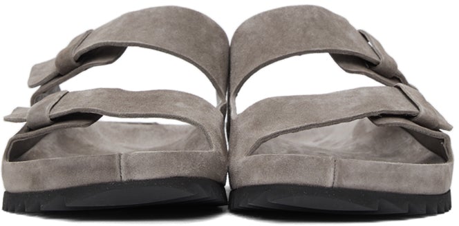 Handcrafted suede slip-on sandals in taupe. Open round toe. Straps at vamp with concealed elasticized detailing. Logo stamp in black at tonal molded footbed. Tonal buffed leather lining. Tonal covered midsole. Treaded rubber sole in black. Supplier color: Otter Upper: leather. Sole: rubber. Brand: Officine Creative