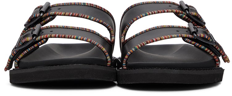 Buffed leather slip-on sandals in black. Textile trim featuring multicolor signature stripe pattern throughout. Open round toe. Adjustable straps with pin-buckle fastening at vamp. Gold-tone logo stamp at molded leather footbed. Tonal treaded rubber outsole. Gunmetal-tone hardware. Supplier color: Black Upper: leather. Sole: rubber. Brand: Paul Smith