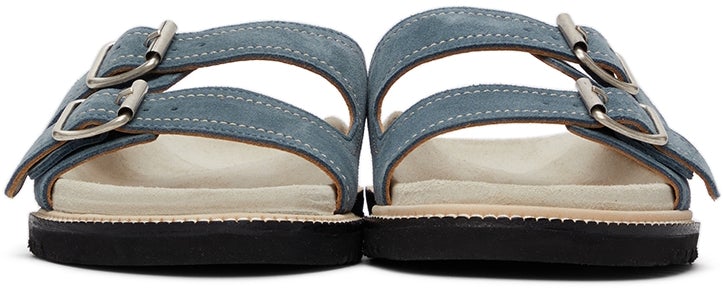 Suede slip-on sandals in blue. Open round toe. Adjustable straps with pin-buckle fastening at vamp. Gold-tone logo stamp at molded suede-covered footbed in beige. Treaded rubber outsole in black. Silver-tone hardware. Contrast stitching in beige. Supplier color: Blue Upper: leather. Sole: rubber. Brand: Paul Smith