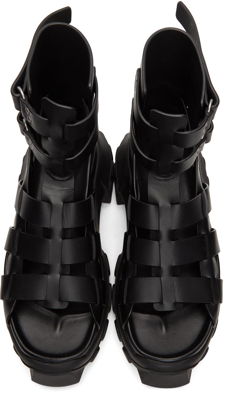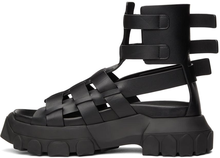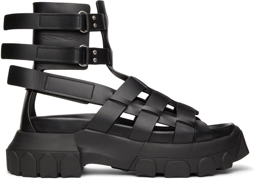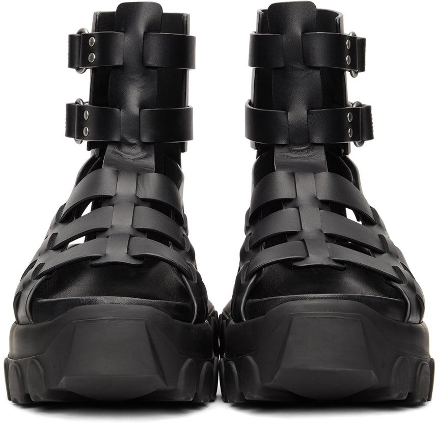 Ankle-high buffed leather sandals in black. Open round toe. Adjustable Velcro straps at vamp and ankle. Logo embossed at footbed. Tonal treaded rubber Air Cushion sole. Silver-tone hardware. Supplier color: Black Upper: leather. Sole: rubber. Brand: Rick Owens