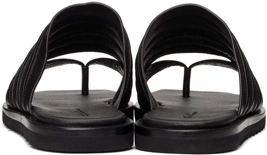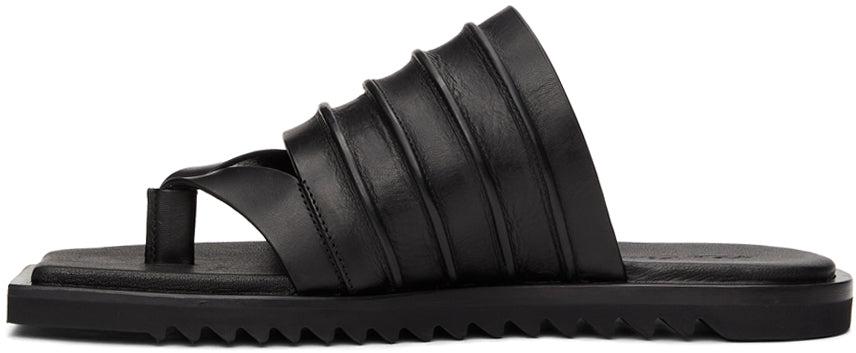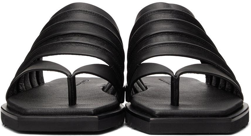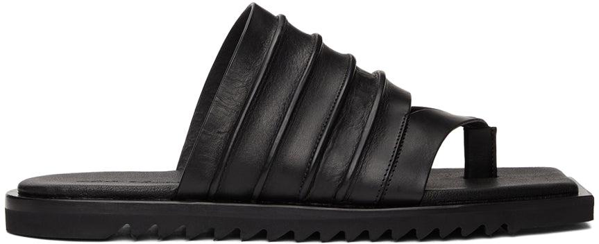 Grained calfskin sandals in black. Open square toe. Logo embossed at tonal rubber footbed. Tonal stacked leather midsole. Supplier color: Black Upper: calfskin. Sole: rubber. Brand: Rick Owens