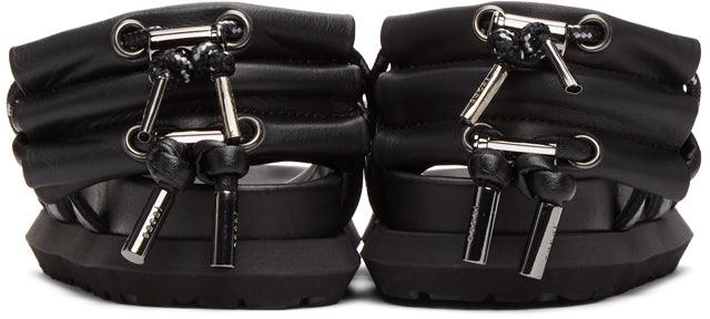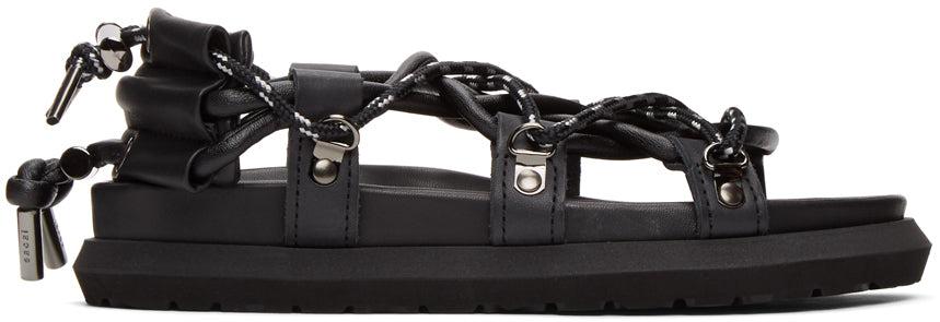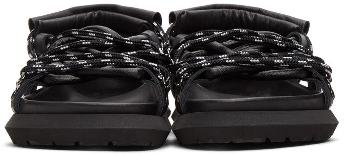 Buffed leather sandals in black. Open round toe. Tonal twin lace-up closures with cord-lock fastening. Molded buffed leather footbed. Tonal Vibram® treaded rubber sole. Tonal hardware. Supplier color: Black Upper: leather. Sole: rubber. Brand: Sacai