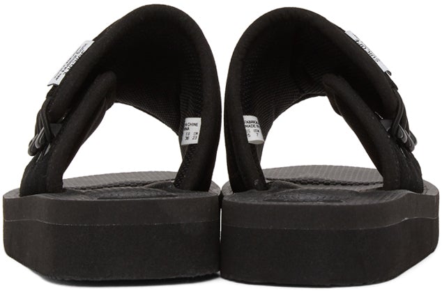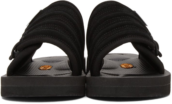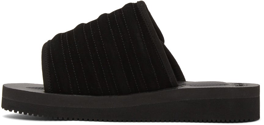 Padded suede slip-on sandals in black. Open round toe. Textile logo flag in white and elasticized hook-eye fastening at vamp. Logo embossed at tonal textured Vibram® EVA rubber footbed. Tonal mesh lining. Tonal foam rubber midsole. Tonal treaded Vibram® Morflex outsole. Supplier color: Black Upper: leather. Sole: rubber. Brand: Suicoke
