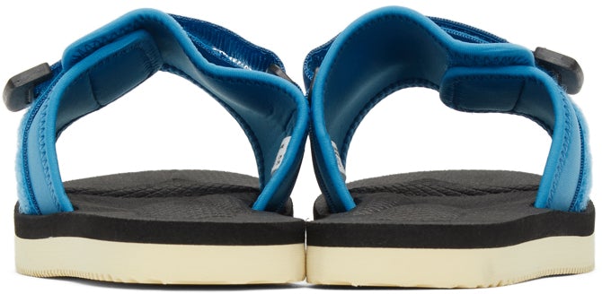 Textile and rubber slip-on sandals in blue. Open round toe. Adjustable Velcro strap featuring logo patch in white at vamp. Logo embossed at molded rubber footbed in black. Treaded rubber sole in off-white. Tonal hardware. Supplier color: Blue Upper: textile, rubber. Sole: rubber. Brand: Suicoke