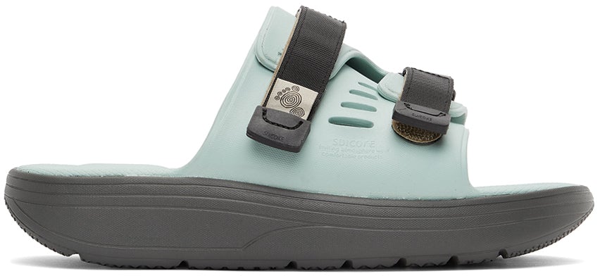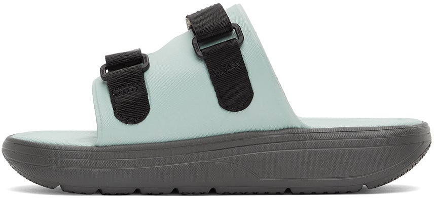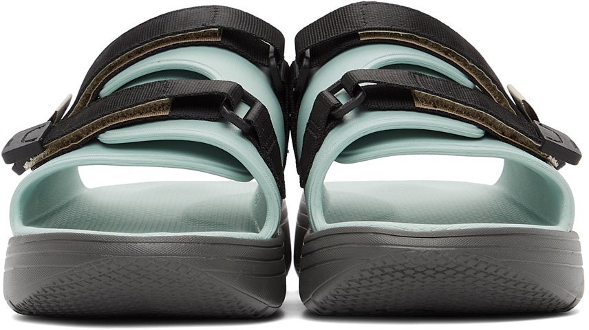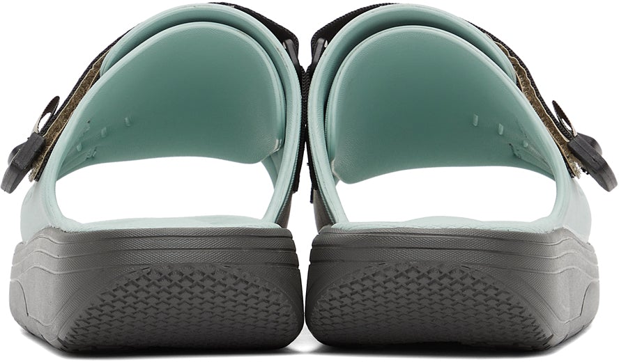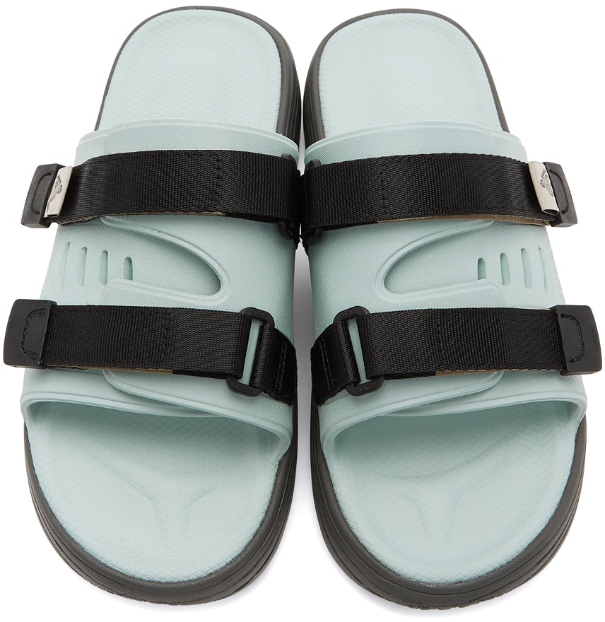 EVA rubber slip-on sandals in blue. Open round toe. Twin adjustable Velcro webbing straps in black, perforated detailing, embossed logo, and logo flag in grey at vamp. Tonal EVA molded foam rubber footbed. Treaded rubber sole in grey. Black hardware. Supplier color: Mint/Black Rubber. Brand: Suicoke