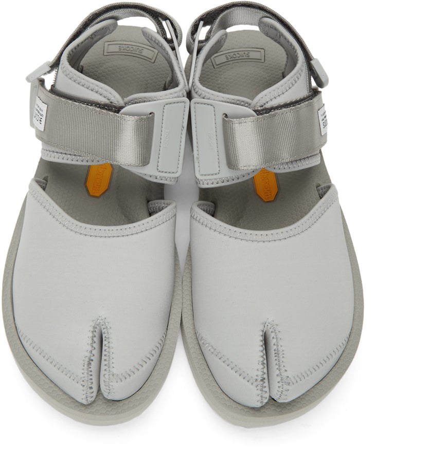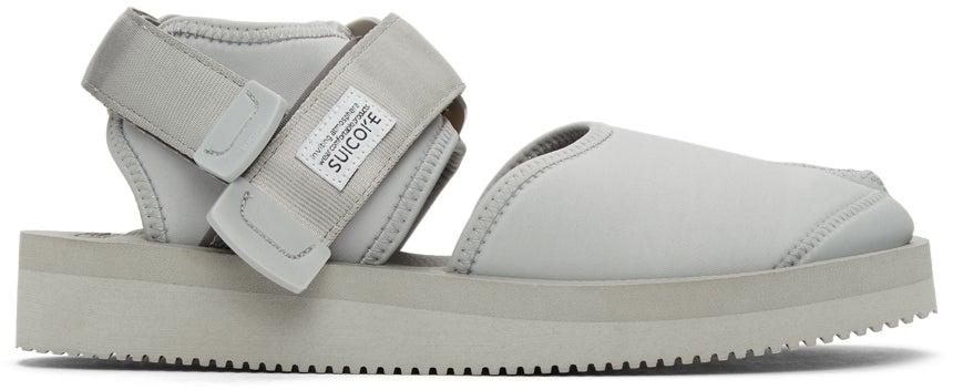Bonded jersey sandals in grey. Tonal webbing trim and topstitching throughout. Round cleft toe. Textile logo patch and adjustable Velcro strap at vamp. Adjustable Velcro ankle strap. Logo embossed at molded Vibram® rubber footbed. Tonal treaded Vibram® rubber sole. Tonal hardware. Supplier color: Grey Upper: textile. Sole: rubber. Brand: Suicoke