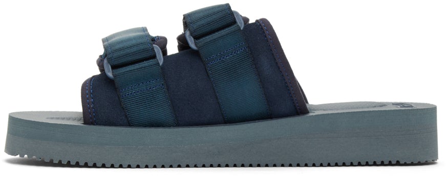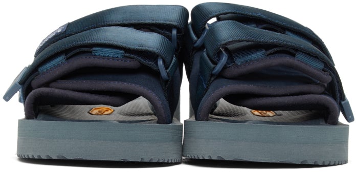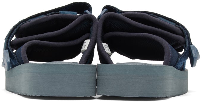 Padded suede and bonded nylon jersey slip-on sandals in navy. Open round toe. Twin adjustable webbing Velcro straps and tonal logo patch at vamp. Tonal logo-embossed molded Vibram® EVA foam rubber footbed. Tonal treaded Vibram® rubber outsole. Tonal hardware. Supplier color: Navy Upper: leather, textile. Sole: rubber. Brand: Suicoke