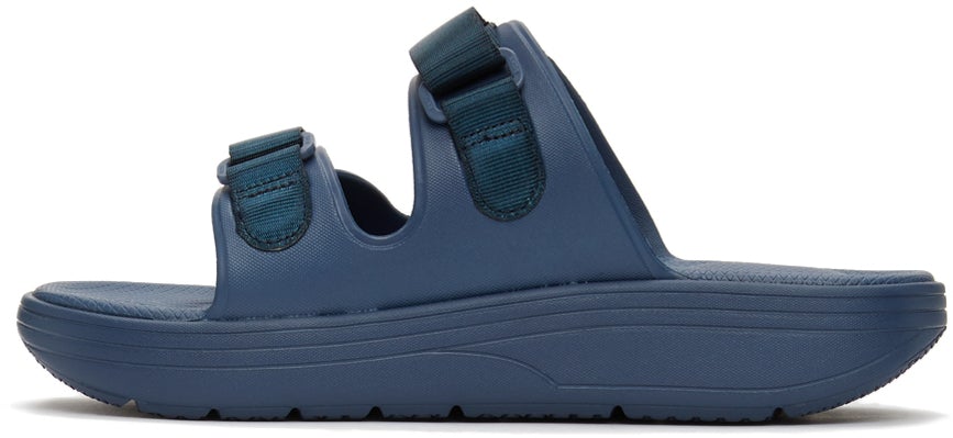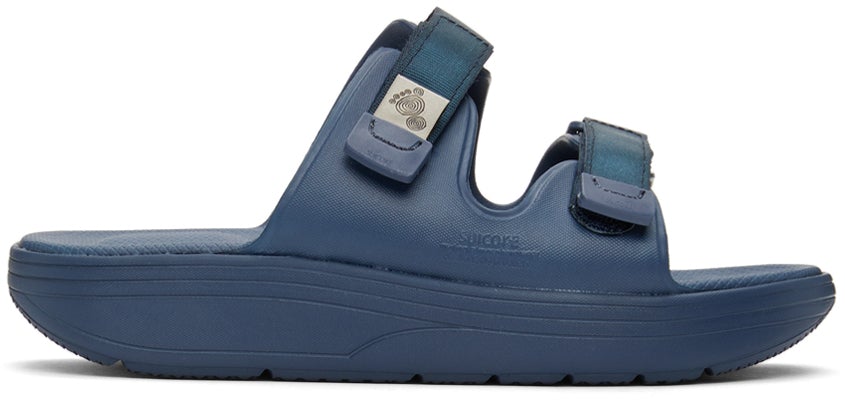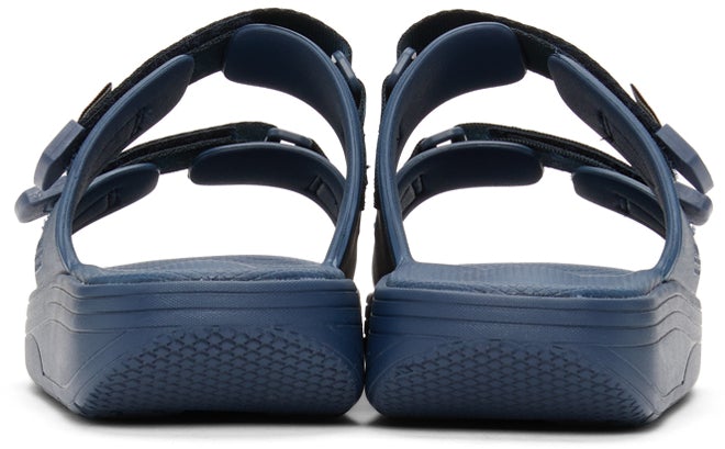 EVA rubber slip-on sandals in navy. Open round toe. Twin adjustable Velcro webbing straps and logo flag in grey at vamp. Logo embossed at outer side. Logo-embossed EVA molded foam rubber footbed. Tonal treaded rubber sole. Tonal hardware. Supplier color: Navy Rubber. Brand: Suicoke
