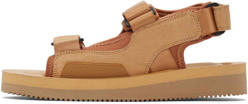 Nylon and faux-suede sandals in tan. Open round toe. Velcro straps and textile logo patch at vamp. Textile logo patch at outer side. Velcro strap at heel. Molded Vibram® footbed. Tonal treaded Vibram® rubber sole. Black hardware. Supplier color: Camel Upper: textile. Sole: rubber. Brand: Suicoke