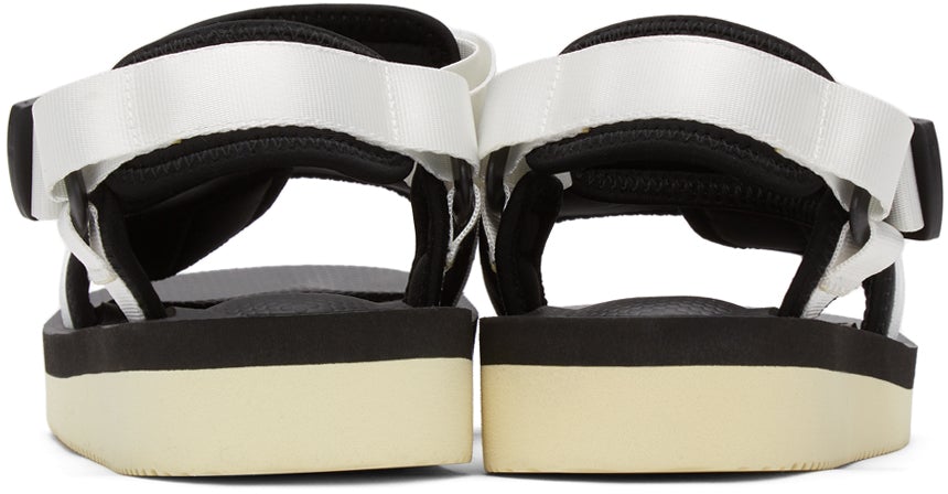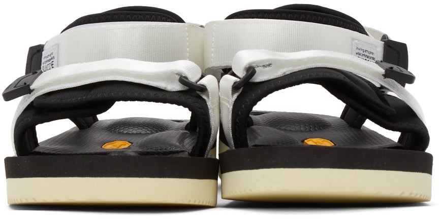 Nylon webbing sandals in white. Open round toe. Adjustable Velcro strap at vamp. Adjustable Velcro strap and textile logo patch at ankle. Padded bonded jersey lining in black. Molded Vibram® footbed in black. Treaded Vibram® rubber sole in yellow. Black hardware. Supplier color: White Upper: textile. Sole: rubber. Brand: Suicoke