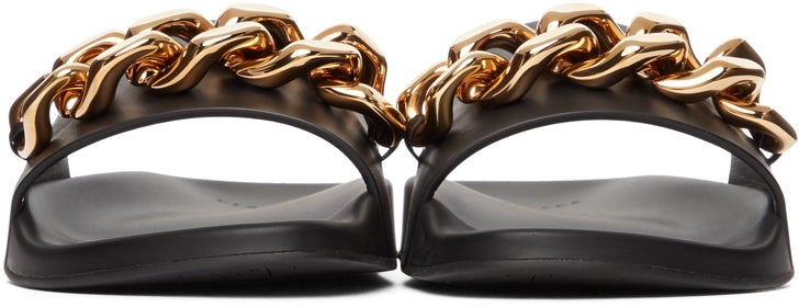 Buffed leather slip-on pool slides in black. Open round toe. Curb chain hardware and signature Medusa hardware at strap. Logo embossed at molded rubber footbed. Tonal rubber outsole. Gold-tone hardware. Supplier color: Black Upper: leather. Sole: rubber. Brand: Versace