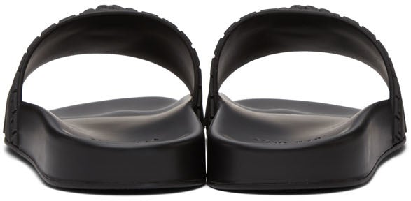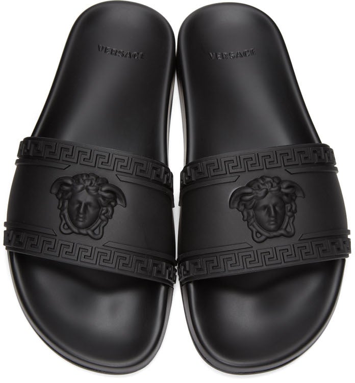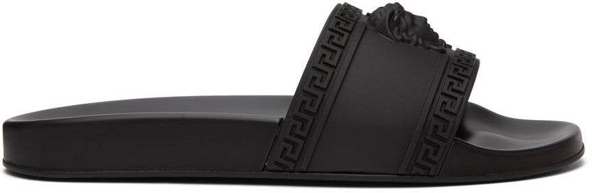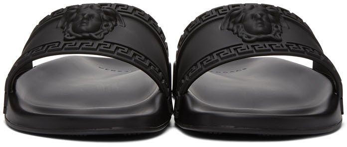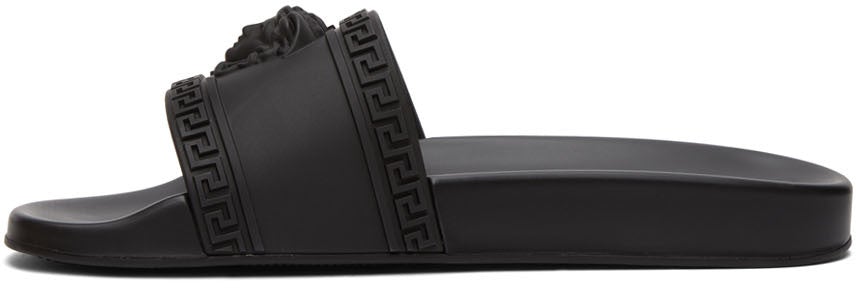 Rubber slip-on sandals in black. Open round toe. Rubberized signature Medusa graphic and Greek key pattern at vamp. Embossed logo at moulded rubber footbed. Treaded rubber sole. Supplier color: Black Rubber. Brand: Versace