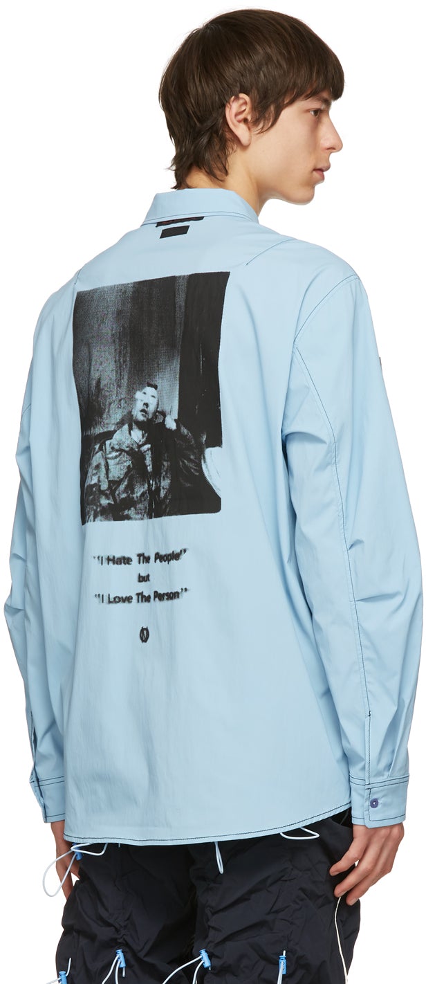 Long sleeve stretch nylon taffeta shirt in blue. Spread collar. Button closure at front. Patch pocket and detachable graphic pins with safety-pin fastening at chest. Printed graphic in black at front and back. Single-button barrel cuffs. Textile logo patch featuring check pattern in multicolor at sleeves. Textile logo patch at back collar. Tonal hardware. Topstitching in black. Supplier color: Sky 95% nylon, 5% spandex. Brand: 99% IS