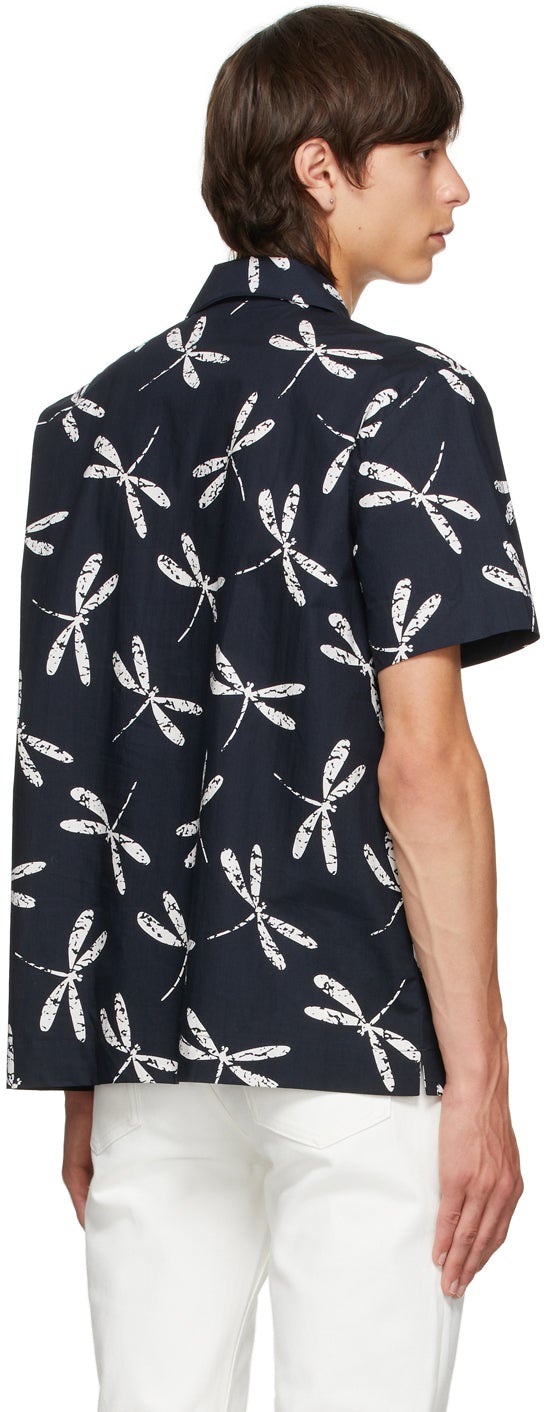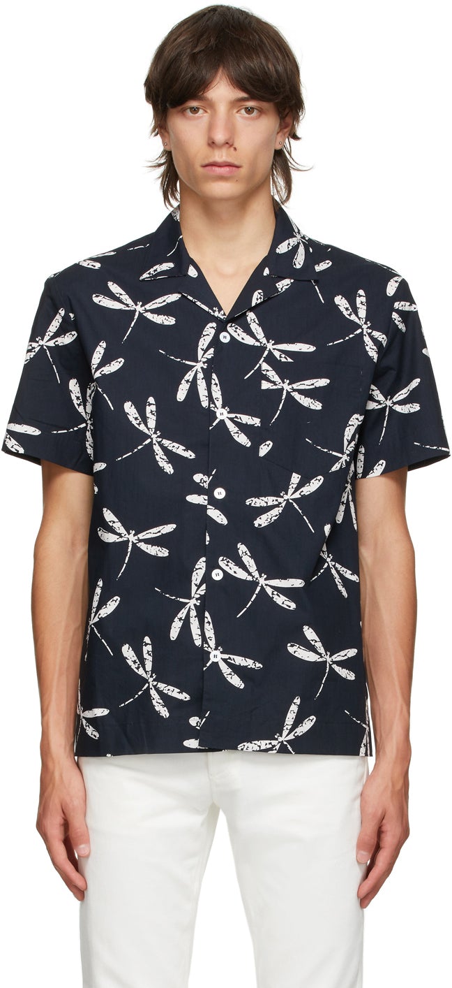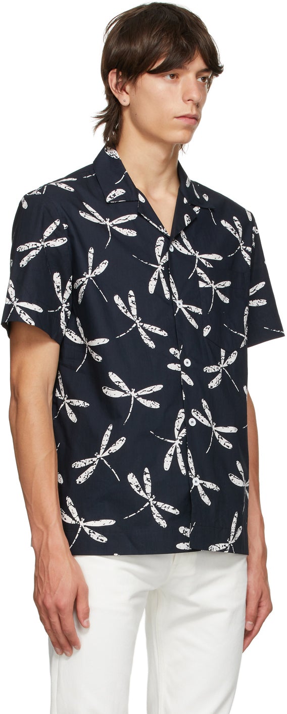 Short sleeve cotton poplin shirt in navy featuring graphic pattern in white throughout. Open spread collar. Button closure at front. Patch pocket at chest. Vents at side seam. Mother-of-pearl hardware. Supplier color: Dark navy blue 100% cotton. Brand: A.P.C.