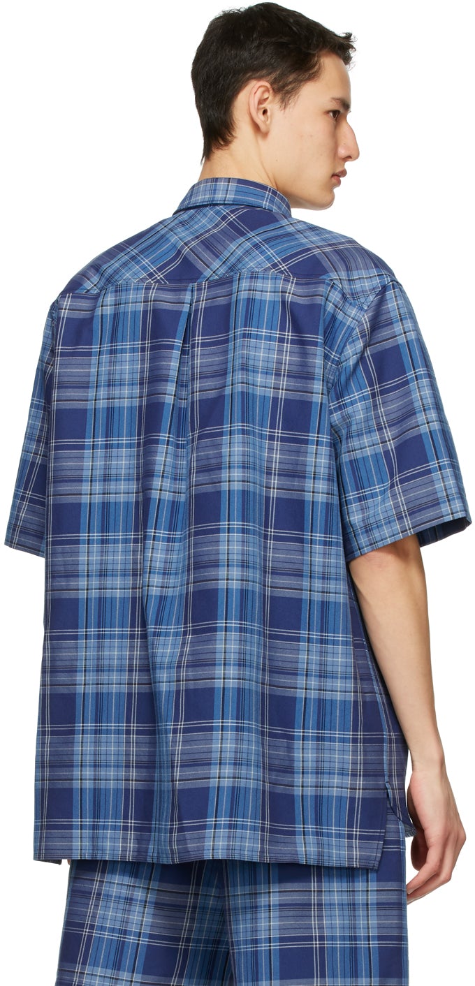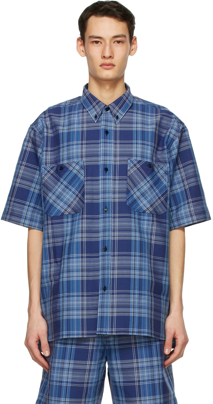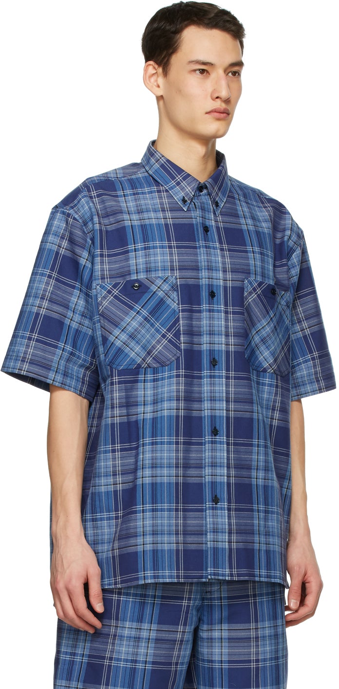 Short sleeve cotton-blend canvas shirt featuring check pattern in tones of blue, black, and off-white throughout. Spread collar. Button closure at front. Patch pockets at chest. Black hardware. Supplier color: Blue/Navy 55% polyester, 45% cotton. Brand: Acne Studios