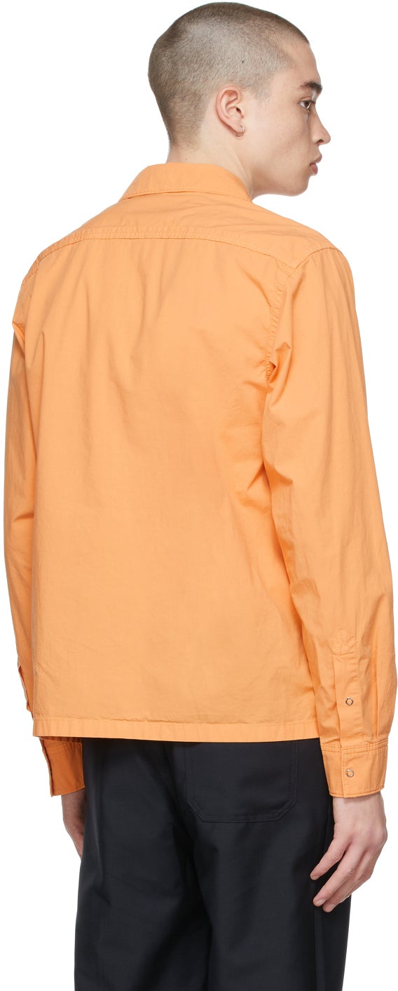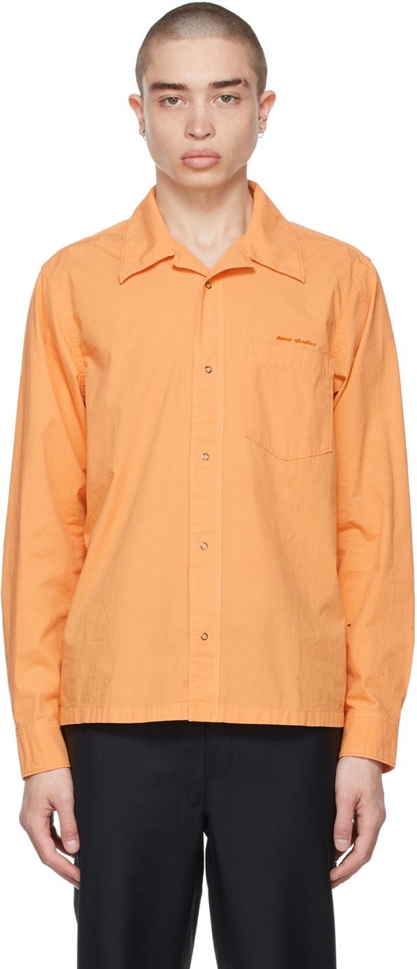 Long sleeve cotton poplin shirt in orange. Open spread collar. Press-stud closure at front. Patch pocket and tonal embroidered logo at chest. Barrel cuffs with press-stud fastening. Cropped hem. Supplier color: Melon orange 100% cotton. Brand: Acne Studios