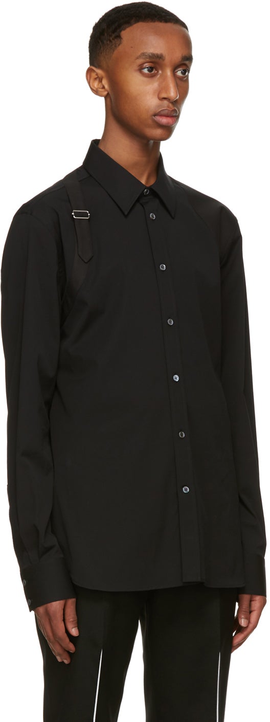 Long sleeve stretch cotton poplin shirt in black. Tonal textured cotton trim throughout. Spread collar. Button closure at front. Adjustable pin-buckle strap at shoulder. Two-button barrel cuffs. Shirttail hem. Logo-engraved mother-of-pearl and silver-tone hardware. Supplier color: Black 97% cotton, 3% elastane. Brand: Alexander McQueen