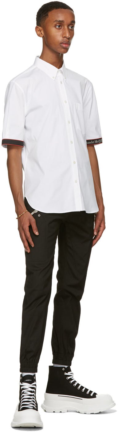 Short sleeve stretch cotton poplin shirt in white. Button-down spread collar. Button closure at front. Patch pocket at chest. Logo woven trim in white, red, and black at cuffs. Central box pleat at back. Shirttail hem. Logo-engraved tonal hardware. Supplier color: White Body: 97% cotton, 3% elastane. Trim: 100% polyester. Brand: Alexander McQueen