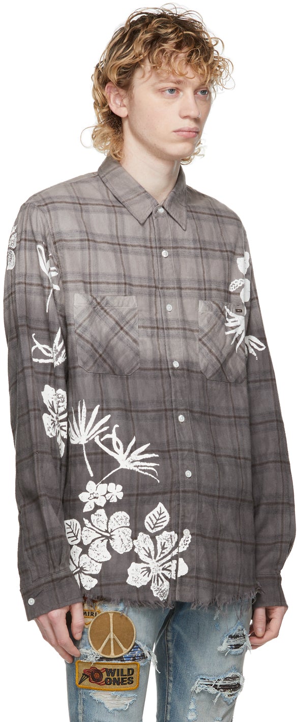 Long sleeve Japanese cotton flannel shirt in grey featuring tonal check pattern. Bleach effect and printed floral pattern in white throughout. Spread collar. Button closure at front. Patch pockets at chest. Single-button barrel cuffs. Frayed edge at shirttail hem. Supplier color: Black 100% cotton. Brand: AMIRI