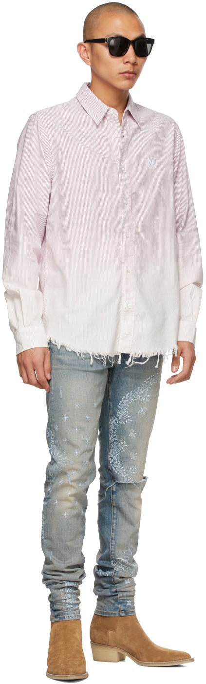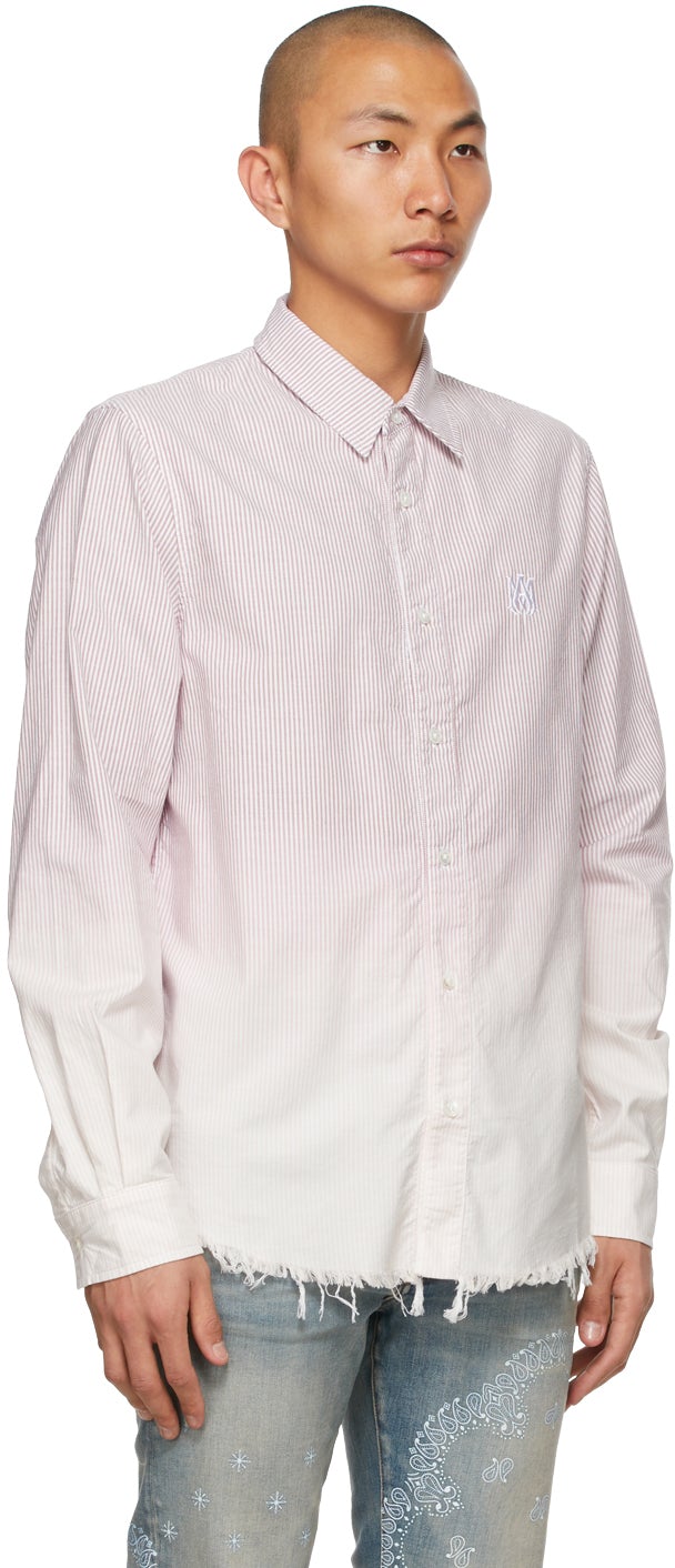 Long sleeve plain-woven cotton shirt featuring stripe pattern in red and white. Bleached effect throughout. Spread collar. Button closure at front. Logo embroidered in white at chest. Single-button barrel cuffs. Frayed edge at hem. Mother-of-pearl hardware. Supplier color: Red 100% cotton. Brand: AMIRI