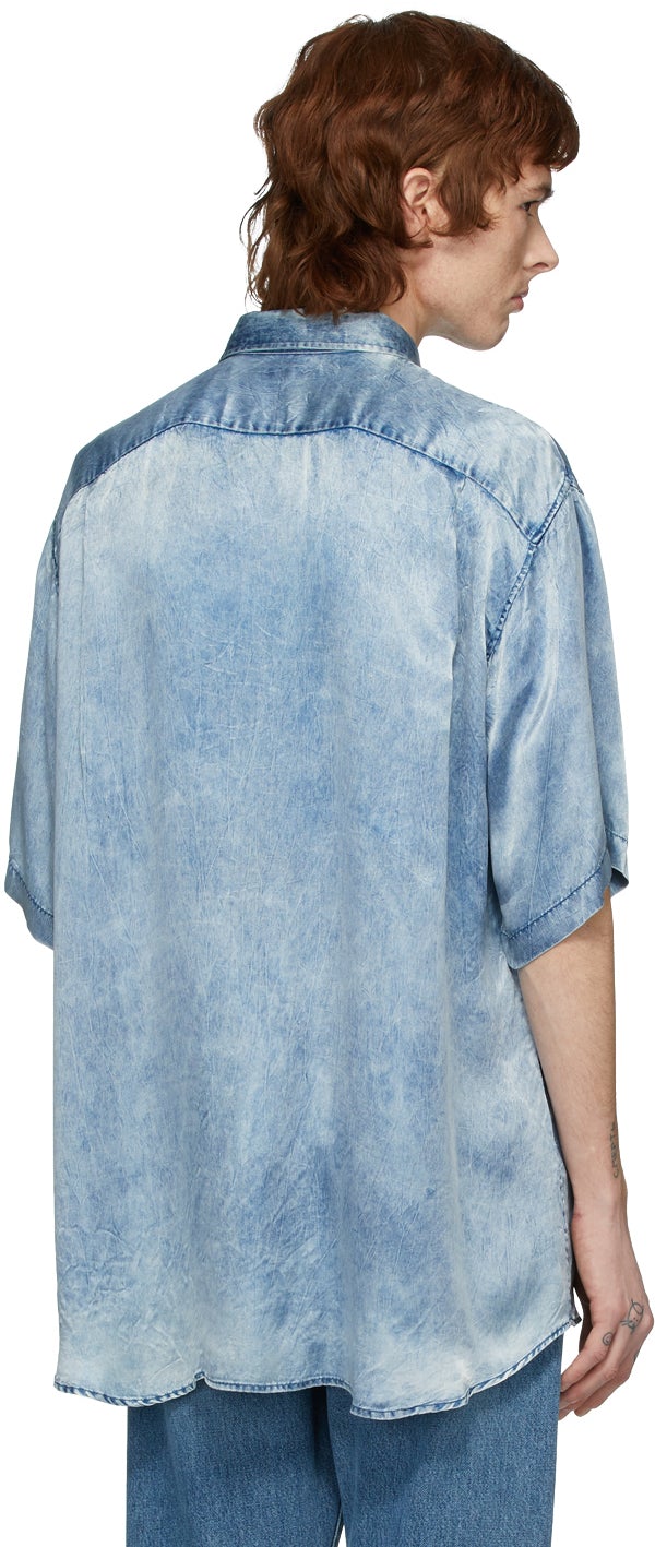 Short sleeve viscose satin shirt in indigo featuring acid wash effect throughout. Spread collar. Button closure at front. Patch pocket at chest. Tonal logo embroidered at shirttail hem. Supplier color: Indigo 100% viscose. Brand: Balenciaga