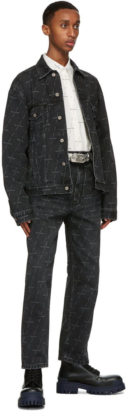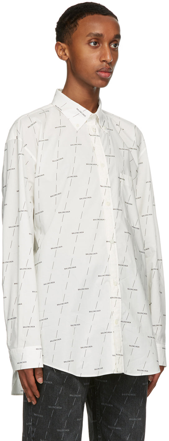 Long sleeve cotton poplin shirt in white featuring printed logo pattern in black throughout. Button-down spread collar. Button closure at front. Single-button barrel cuffs. Shirttail hem. Supplier color: White 100% cotton. Brand: Balenciaga