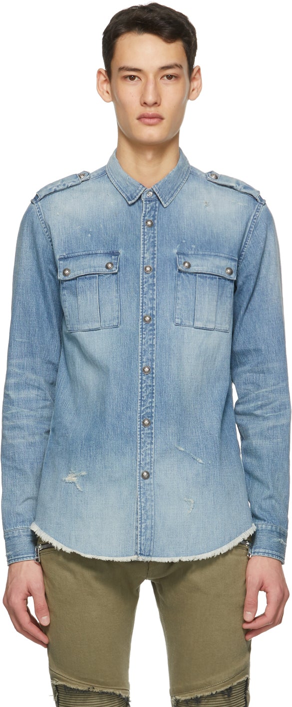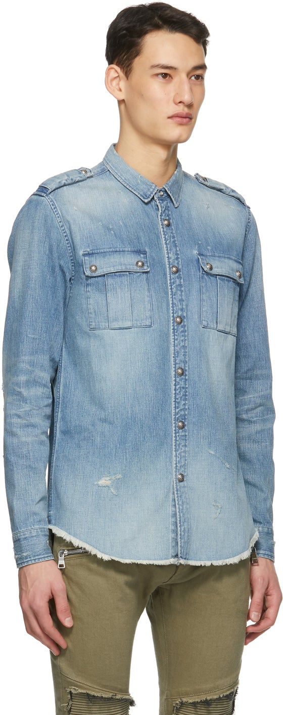 Long sleeve non-stretch denim shirt in blue. Distressing, whiskering, and fading throughout. Spread collar. Press-stud closure at front. Flap pockets at chest. Epaulets with press-stud fastening. Tonal logo embossed at back. Antiqued silver-tone hardware. Supplier color: Blue 100% cotton. Brand: Balmain