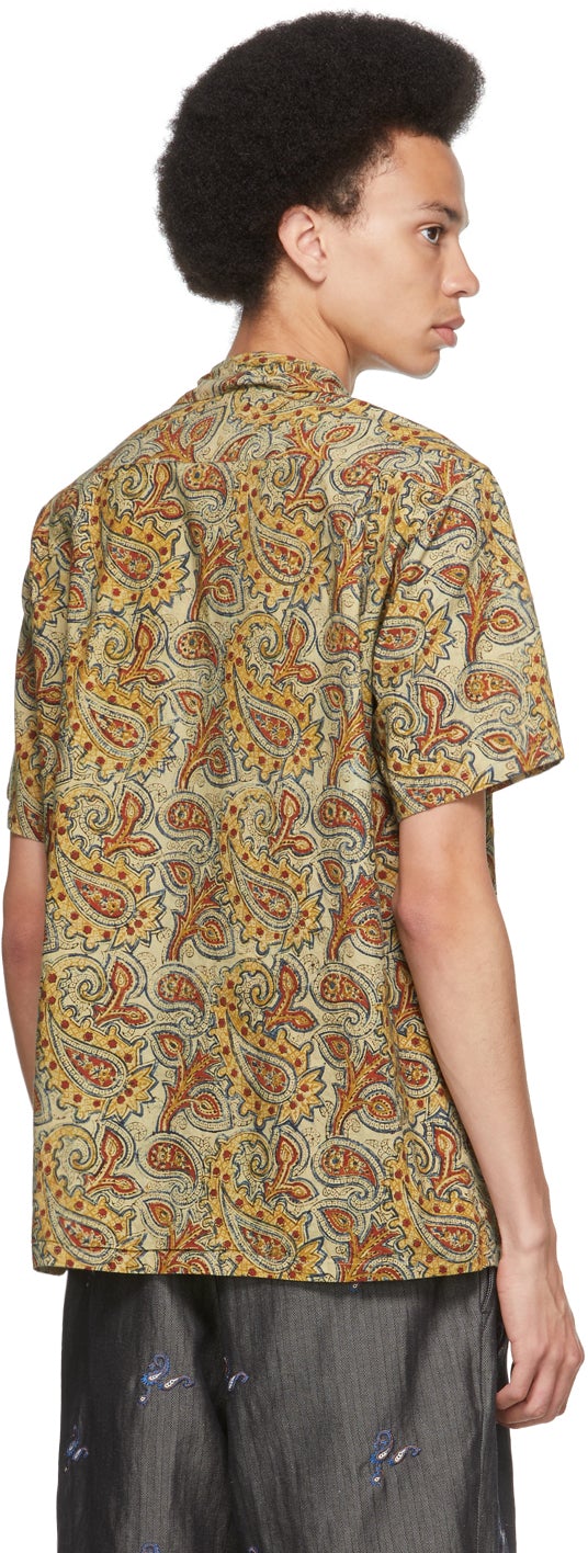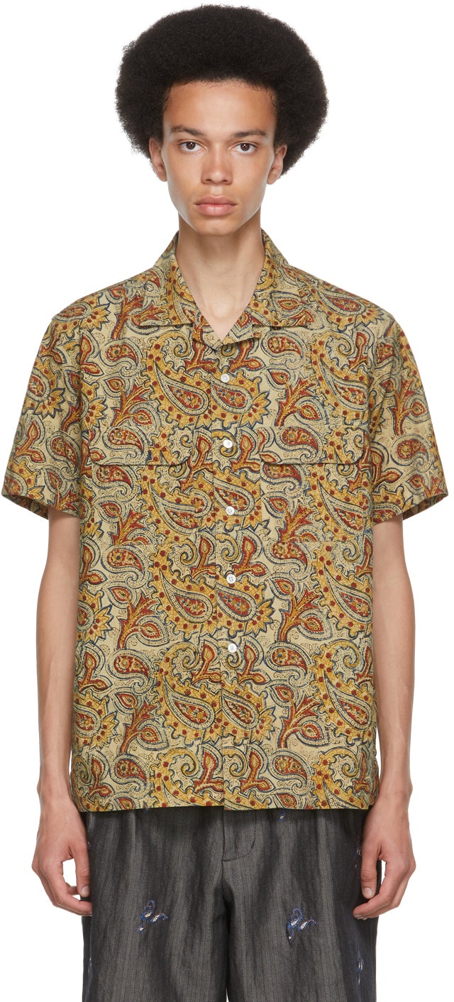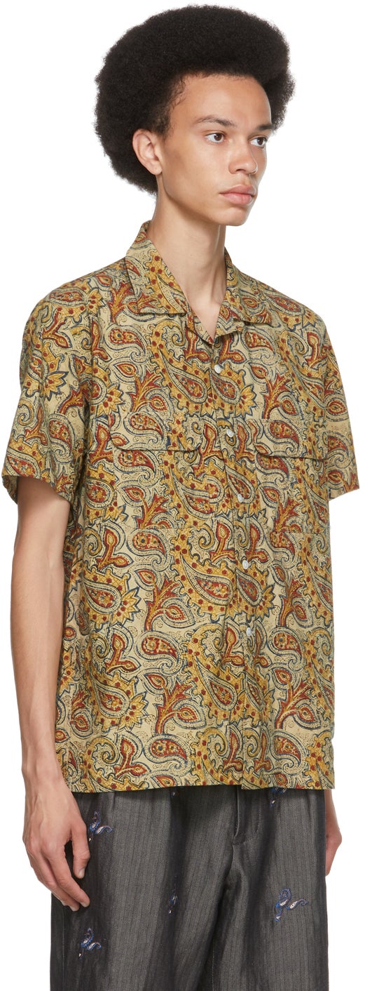 Short sleeve plain woven cotton shirt in beige featuring multicolor hand-printed graphic pattern. Open spread collar. Button closure at front. Flap pockets at chest. Box pleat at back yoke. White hardware. Supplier color: Beige 100% cotton. Brand: BEAMS PLUS