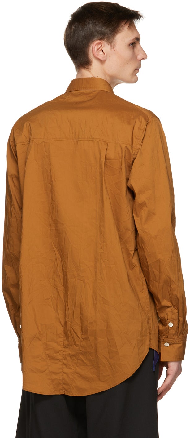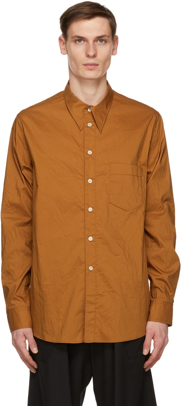Long sleeve crinkled cotton-blend taffeta shirt in tan. Spread collar. Button closure at front. Patch pocket at chest. Single-button barrel cuffs. Supplier color: Walnut 70% cotton, 30% polyester. Brand: BED J.W. FORD