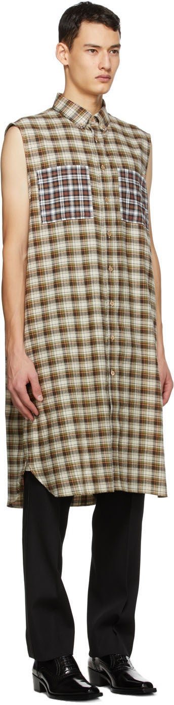Sleeveless cotton flannel shirt featuring check pattern in khaki, brown, orange, and beige. Spread collar. Button closure at front. Patch pockets at chest featuring check pattern in brown, black, and white. Shirttail hem. Supplier color: Beige 100% cotton. Brand: Burberry