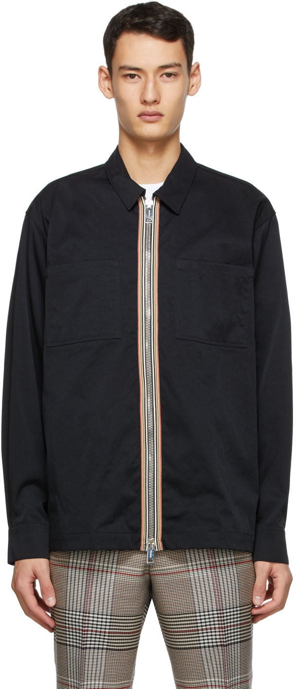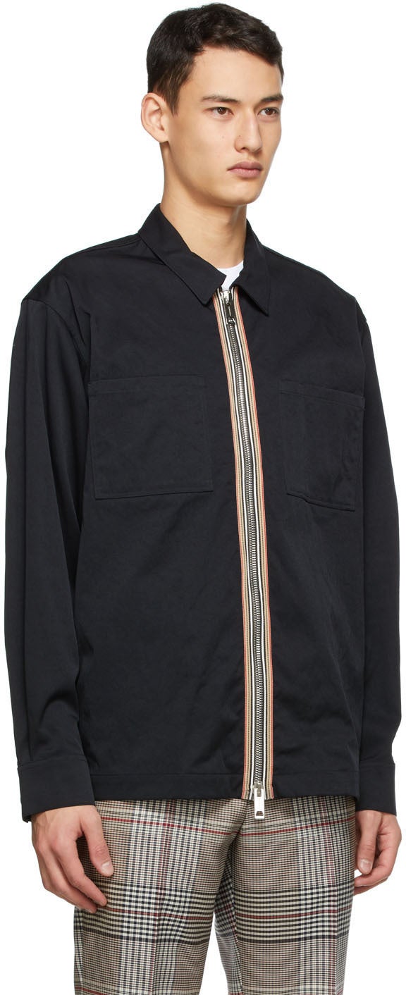 Long sleeve canvas shirt in black. Spread collar. Zip closure at front. Knit stripes in black, white, beige and red at front. Patch pockets at chest. Single-button barrel cuffs. Silver-tone hardware. Supplier color: Black 100% polyamide. Brand: Burberry