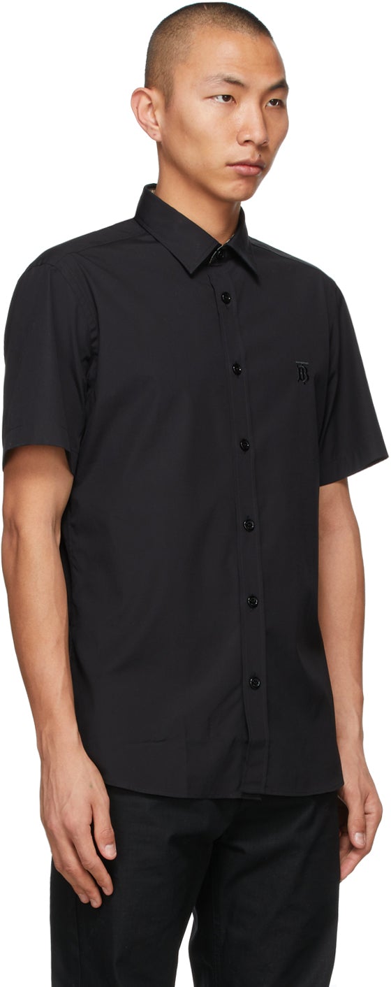 Short sleeve stretch cotton poplin shirt in black. Spread collar. Button closure at front. Tonal logo embroidered at chest. Shirttail hem. Tonal hardware. Supplier color: Black 97% cotton, 3% elastane. Brand: Burberry