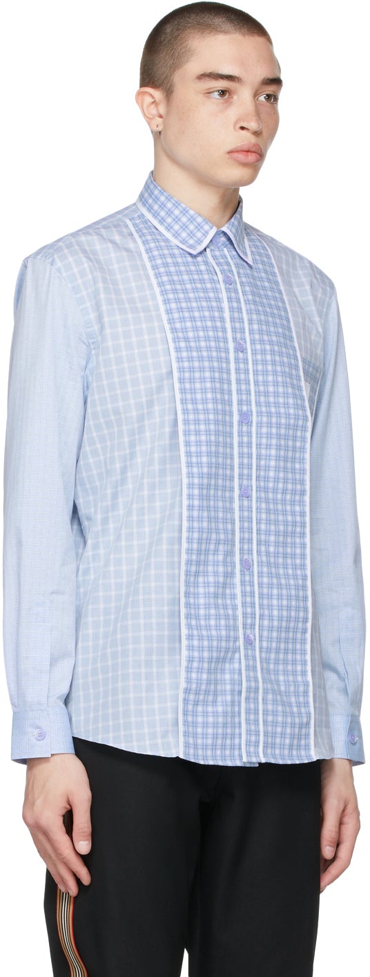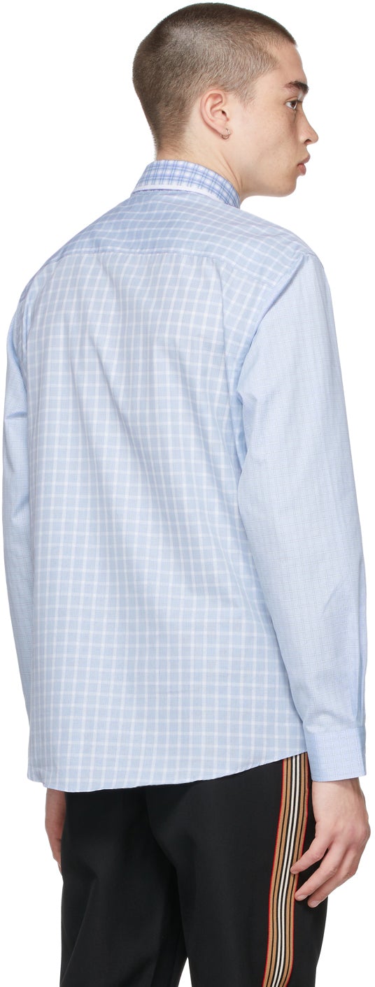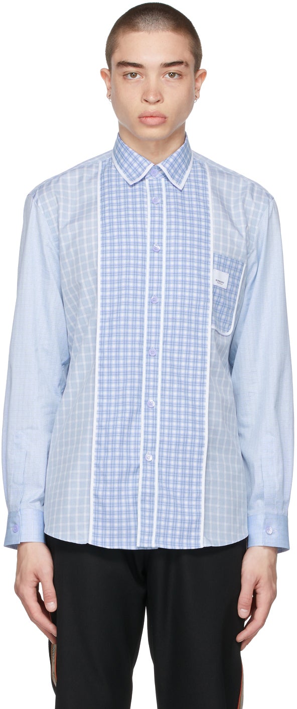 Long sleeve paneled cotton poplin and and plain-woven cotton-blend shirt featuring check pattern in blue and white. Piping in white throughout. Spread collar. Button closure at front. Patch pocket and textile logo patch in white at chest. Single-button barrel cuffs. Shirttail hem. Tonal logo-engraved mother-of-pearl hardware. Supplier color: Pale blue Body: 100% cotton. Trim: 91% cotton, 7% cashmere, 2% other fibres. Brand: Burberry