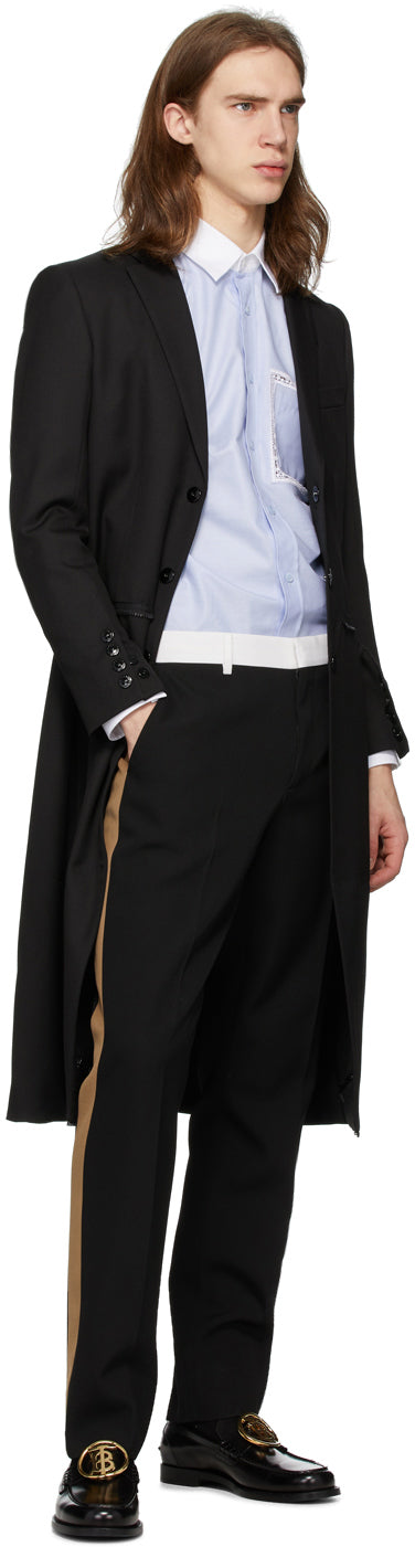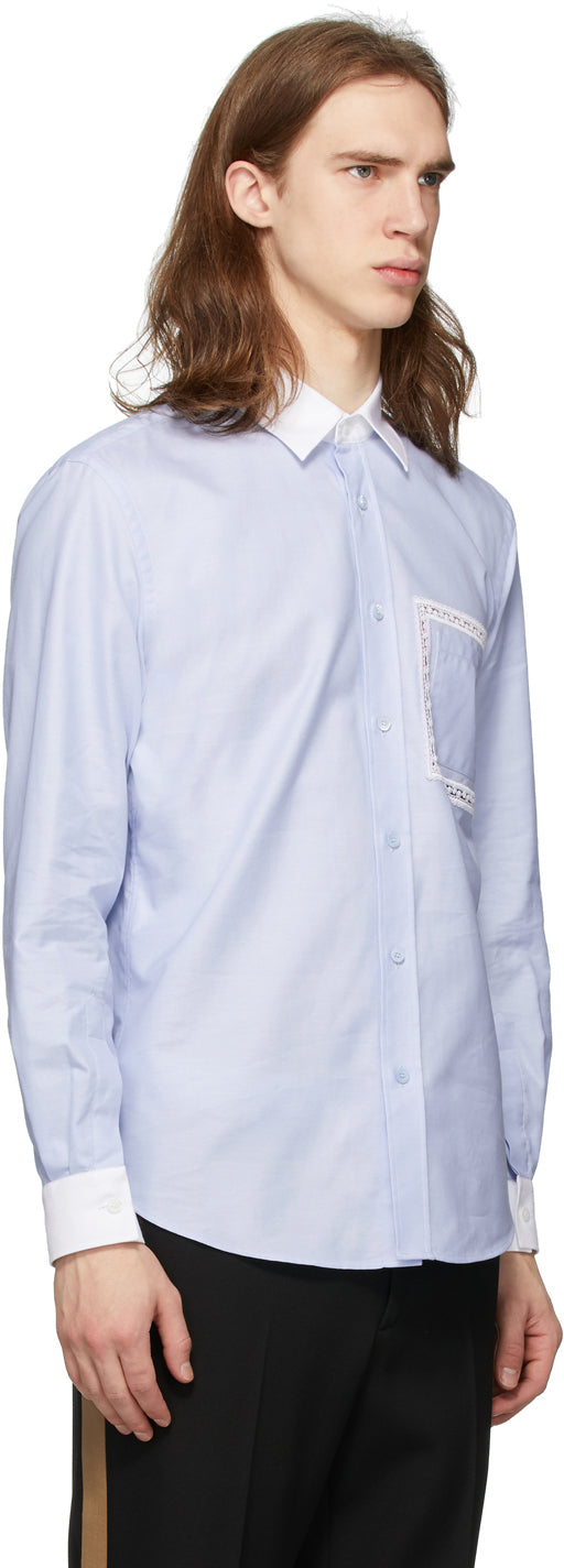 Long sleeve cotton Oxford cloth shirt in blue. Spread collar in white. Button closure at front. Welt pocket and lace detailing in white and black at chest. Single-button barrel cuffs in white. Mother-of-pearl hardware. Supplier color: Pale blue 100% cotton. Brand: Burberry