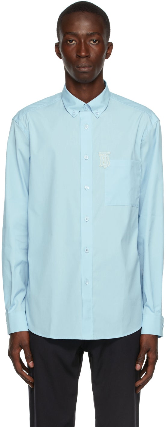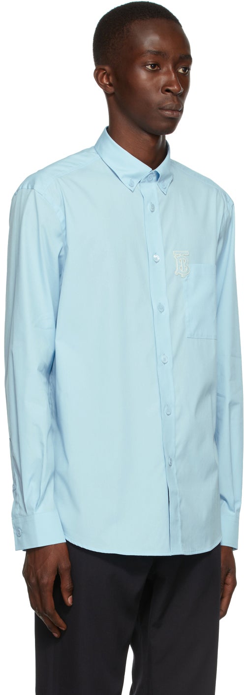 Long sleeve stretch cotton poplin shirt in blue. Button-down spread collar. Button closure at front. Logo embroidered in blue and white at chest. Patch pocket at chest. Single-button barrel cuffs. Shirttail hem. Tonal hardware. Supplier color: Pale blue 97% cotton, 3% elastane. Brand: Burberry