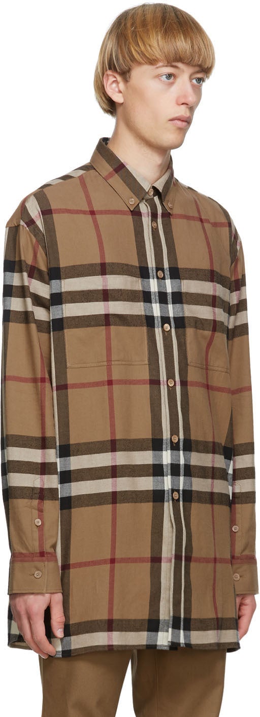 Long sleeve cotton flannel shirt in brown featuring check pattern in red, black, grey, and off-white. Button-down spread collar. Button closure at front. Patch pockets at chest. Single-button barrel cuffs. Locker loop and box pleat at back yoke. Shirttail hem. Tonal logo-engraved hardware. Supplier color: Birch brown 100% cotton. Brand: Burberry