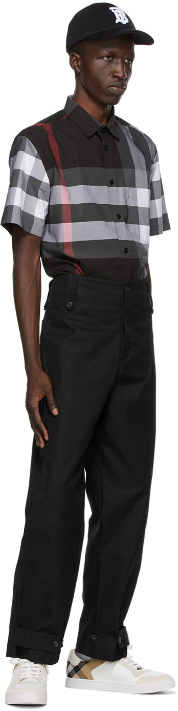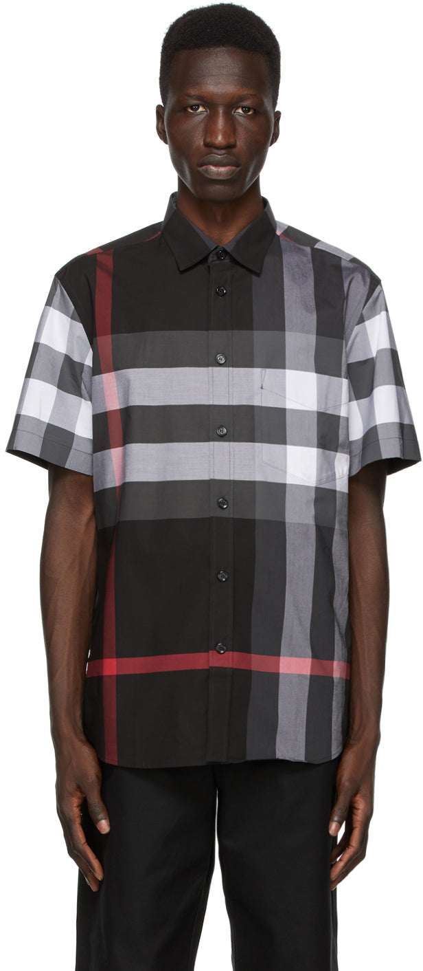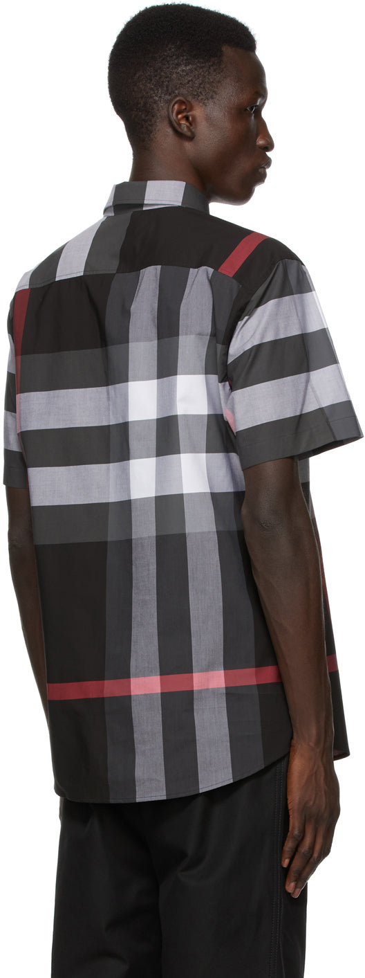Short sleeve stretch cotton poplin shirt featuring signature check pattern in tones of grey, white, red, and black throughout. Spread collar. Button closure at front. Patch pocket at chest. Shirttail hem. Logo-engraved black hardware. Supplier color: Charcoal IP 95% cotton, 5% elastane. Brand: Burberry