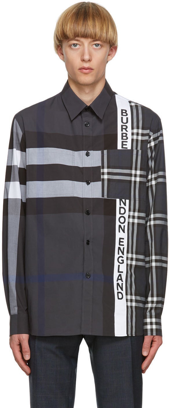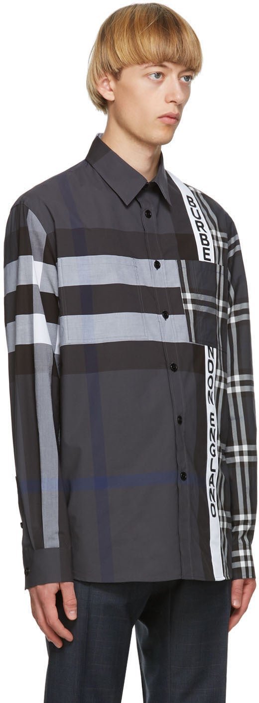 Long sleeve paneled stretch woven cotton, plain-woven cotton, and cotton poplin shirt in grey featuring mismatched check patterns in white and black throughout. Spread collar. Button closure at front. Logo printed in black at front. Patch pockets at chest. Single-button barrel cuffs. Shirttail hem. Mother-of-pearl hardware. Supplier color: Dark pewter 95% cotton, 5% elastane. Brand: Burberry