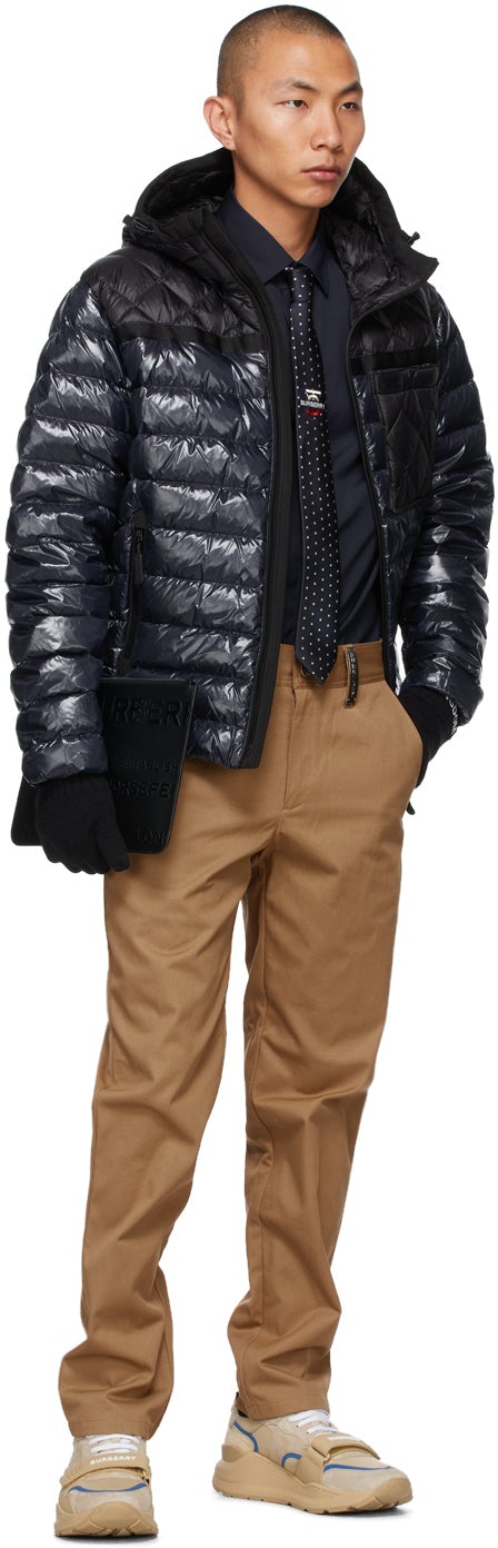 Short sleeve stretch cotton poplin shirt in navy. Spread collar. Button closure at front. Tonal logo embroidered at chest. Shirttail hem. Tonal hardware. Supplier color: Navy 97% cotton, 3% elastane. Brand: Burberry