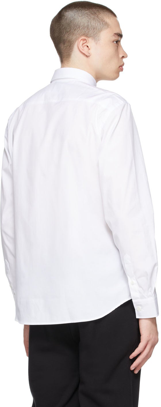 Long sleeve stretch cotton poplin shirt in white. Spread collar. Button closure at front. Tonal logo embroidered at chest. Concealed signature check pattern at two-button barrel cuffs. Shirttail hem. Logo-engraved Mother-of-pearl hardware. Supplier color: White 97% cotton, 3% elastane. Brand: Burberry