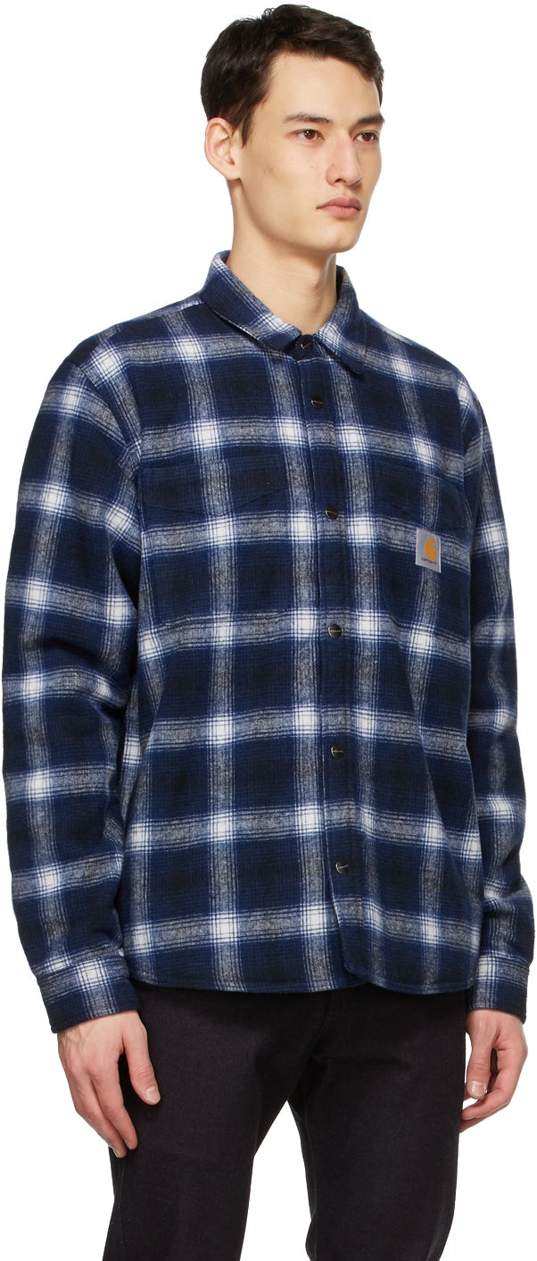 Long sleeve wool-blend flannel shirt featuring check pattern in tones of blue, black, and white. Spread collar. Button closure at front. Textile logo patch and patch pockets at chest. Single-button barrel cuffs. Fleece lining in black at body. Nylon taffeta lining in black at sleeves. Fully lined. Logo engraved silver-tone hardware. Supplier color: Navy Body: 55% polyester, 40% wool, 5% other. Lining 1: 100% nylon. Lining 2: 100% polyester. Padding: 100% polyester. Brand: Carhartt Work In Progress