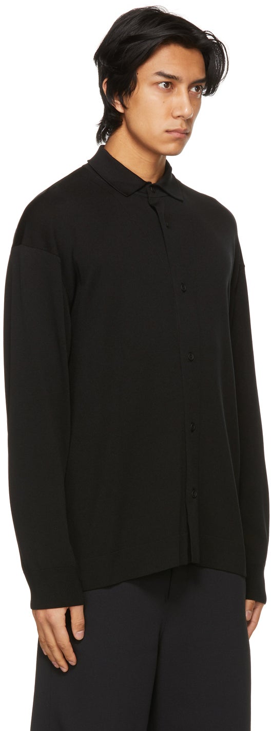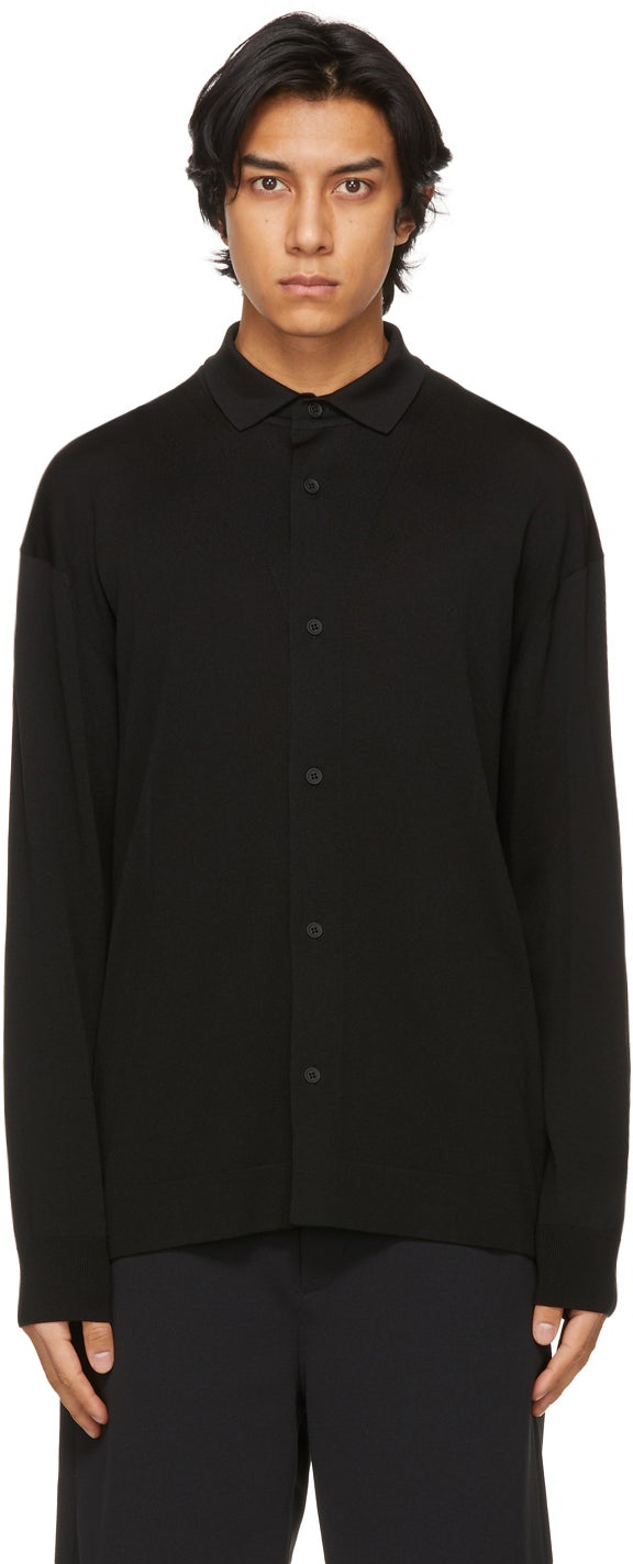 Long sleeve knit cupro-blend shirt in black. Rib knit spread collar, cuffs, and hem. Button closure at front. Rib knit detailing at back. Tonal hardware. Supplier color: Black 60% cupro, 40% polyester. Brand: CFCL