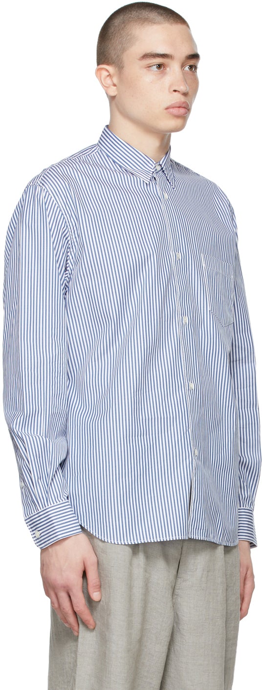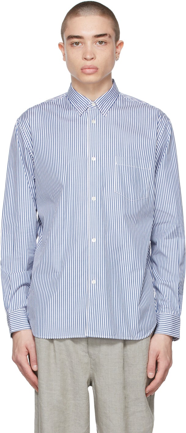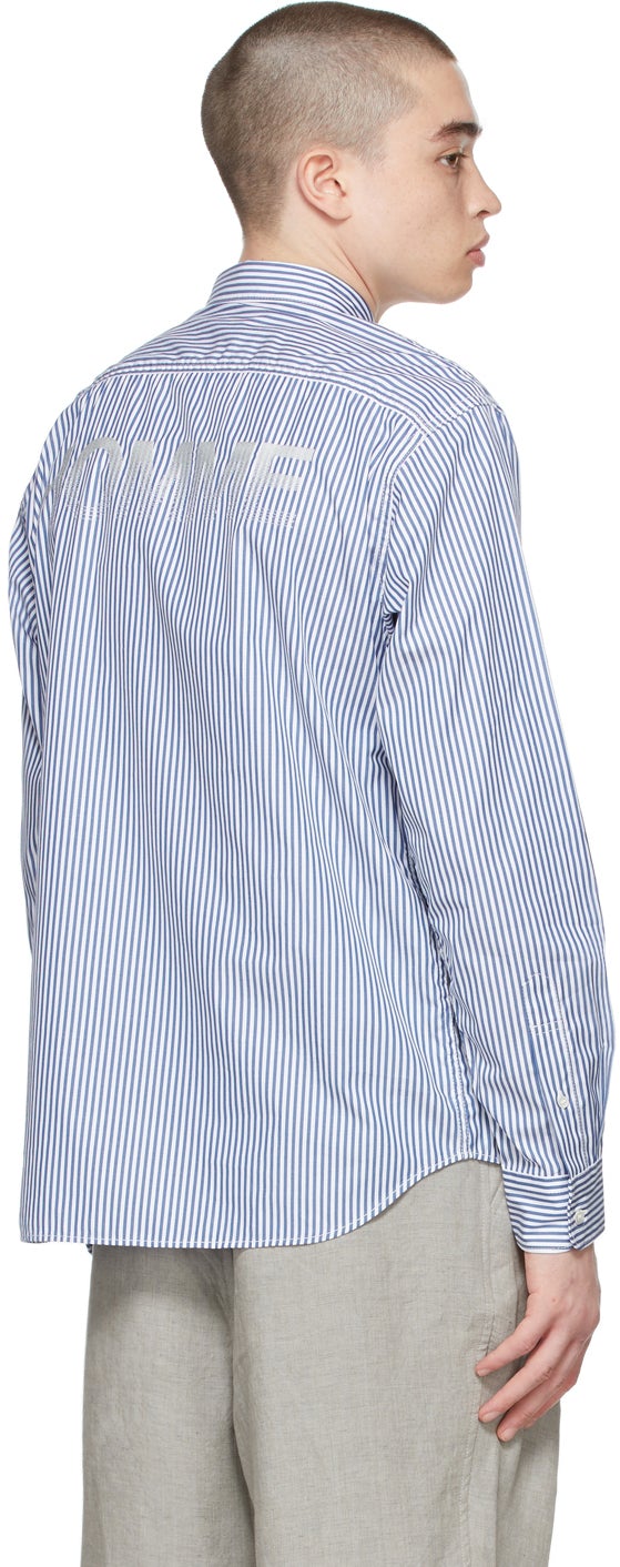 Long sleeve cotton poplin shirt featuring stripe pattern in blue and white throughout. Spread collar. Button closure at front. Patch pocket at chest. Logo embroidered in white at back. Single-button barrel cuffs. Supplier color: Navy Body: 100% cotton. Trim: 100% curpo. Brand: Comme des Garçons Homme