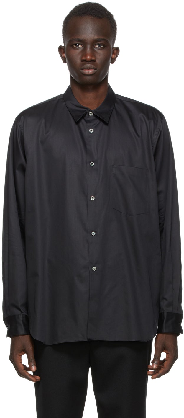 Long sleeve cotton broadcloth shirt in black. Spread collar. Button closure at front. Patch pocket at chest. Single-button barrel cuffs. Cut-out at side-seams. Shirttail hem. Mother-of-pearl hardware. Supplier color: Black 100% cotton. Brand: Comme des Garçons Homme Plus