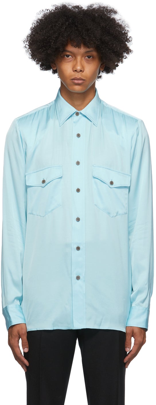 Long sleeve satin shirt in blue. Spread collar. Button closure at front. Flap pockets at chest. Padded shoulders. Two-button barrel cuffs. Vented side-seams. Supplier color: Light blue 100% viscose. Brand: Dries Van Noten