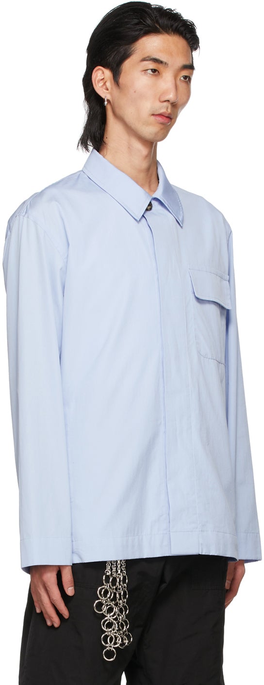 Long sleeve cotton poplin shirt in blue. Button accent at spread collar. Concealed button closure at front. Flap pocket at chest. Welt pockets at waist. Tortoiseshell hardware. Supplier color: Light blue 100% cotton. Brand: Dries Van Noten